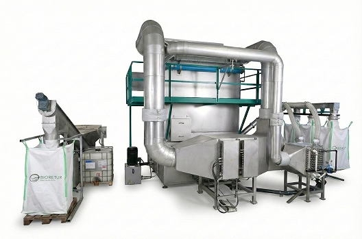 Die rechts dargestellte Anlage zeigt ein Einzelmodul mit 300 kg/h Inputmaterial und lässt sich modular auf höhere Durchsätze erweitern. Ab einer Größe von vier Einzelmodulen ist es möglich zusätzliche Komponenten zur Energierückgewinnung zu intergieren. Dies reduziert den Energieverbrauch signifikant.
