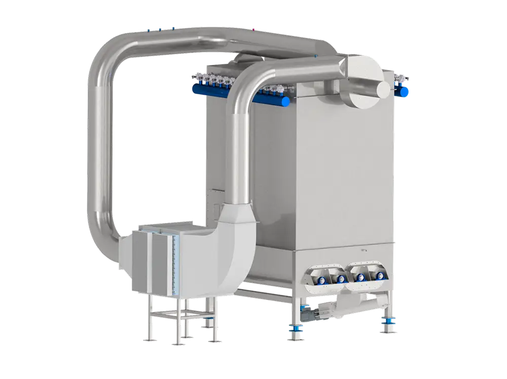 Der überhitzte Dampf wird zurück in die Mischkammer geleitet, um das feuchte Material zu trocknen. Der Auslass ist unterhalb der Filter positioniert, um eine gute Zirkulation im Trockner zu gewährleisten.
